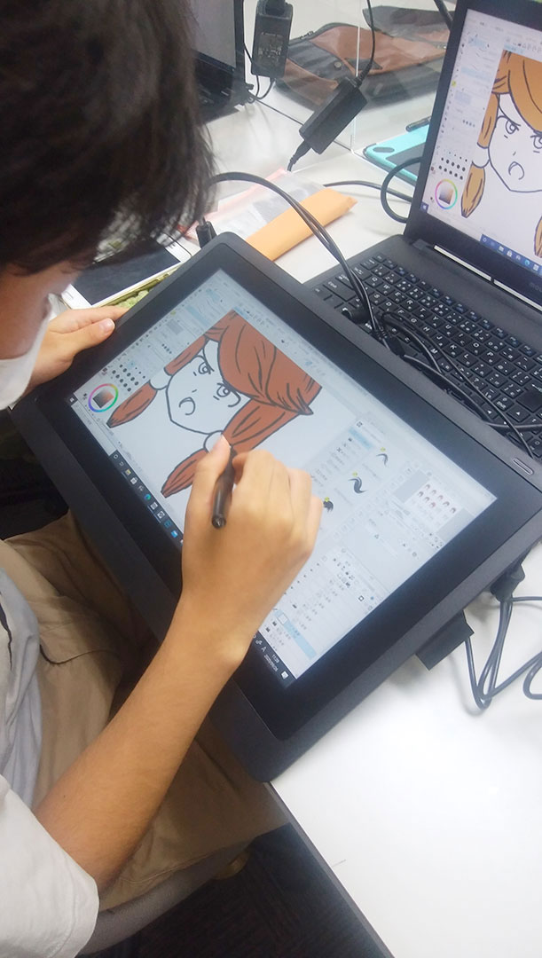 ます。同時に鉛筆やペン、定規などアナログの道具を 使い、キャラクターの描き方を学んでいきます。 様々なキャラクターを描く技術を身につけ、内面描写 までできるように授業を進めていきます。 ◇週1回 2時間 全12回(チケット)制 ◇入学金5.500円 受講料4回分16.000円 先払い制 ◇対象:中学生以上 ☆ノートパソコン・iPadの持込み可 ☆Skypeによるリアルタイムオンライン授業の受講可 ●授業内容