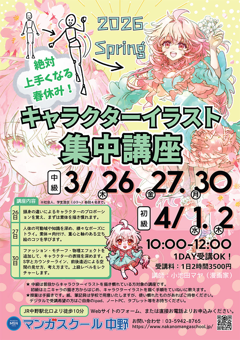 3月26日(木)、27日(金)、30日(月)の3日間と、4月1日(水)、2日(木)の2日間で、キャラクターイラスト集中講座を開講いたします!